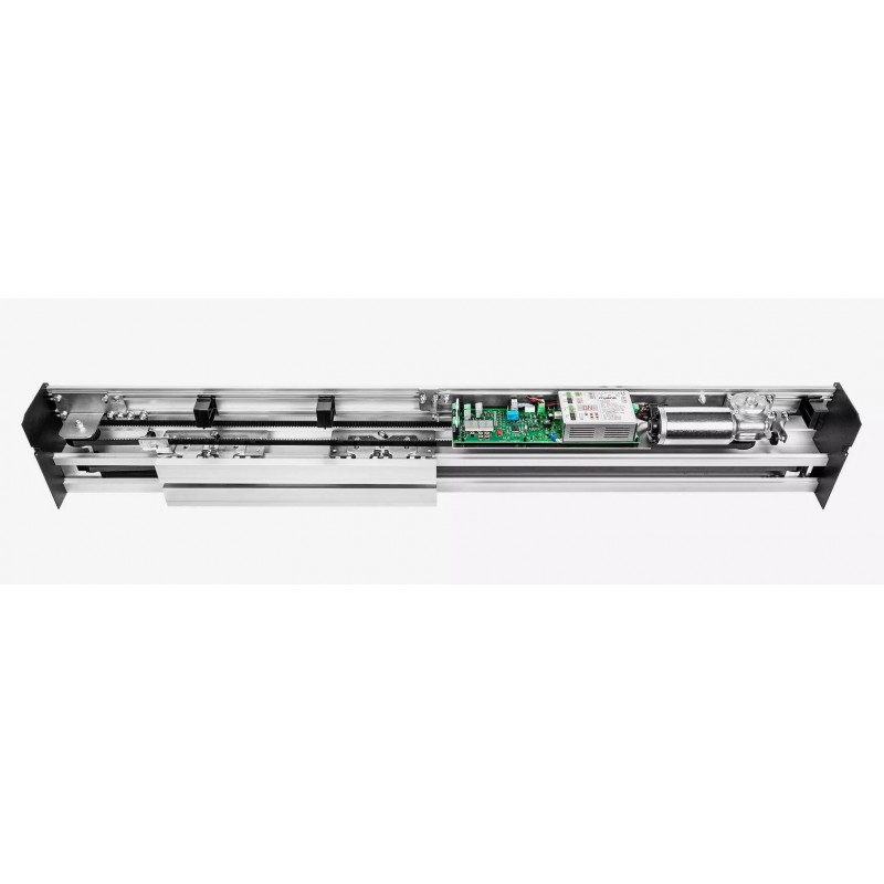 Automatisme 24V PRE-ASSEMBLE pour porte piétonnes coulissantes TELESCOPIQUES à 4 vantaux MYONE LUCE T, poids maxi 4 x 70Kg, finition ALUMINIUM ANODISE, largeur de passage Lmax 1860mm, dimensions de la poutre longueur B2900mm, hauteur 120mm, profondeur 207.5mm, largeur des portes (non fournie) jusqu'à 4 x 510 mm, centrale de gestion intégrée, usage continu 100%, vitesse maxi 0.8m/s, alimentation 100/240Vac consommation maximale 70W en fonctionnement, 3W en stand-by