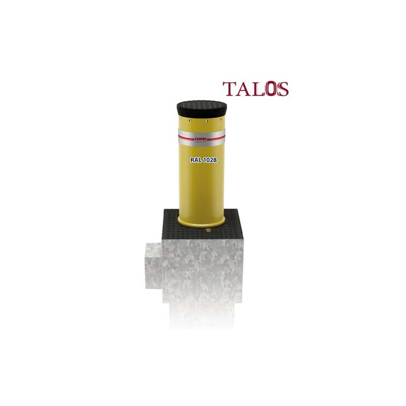 Borne escamotable AUTOMATIQUE hydraulique FADINI TALOS 9480HRC, course 800mm, diamètre 275mm, épaisseur 4mm, contrainte 400mm, acier S235J coloris RAL1028 (jaune melon), DOUBLE fin de course (haut et bas), LED signalisation, résistance au choc 70KJ, résistance à la rupture 420KJ, temps de montées 3.5s, temps de descente 3.2s, livrée avec COFFRE FONDATION galvanisé à chaud