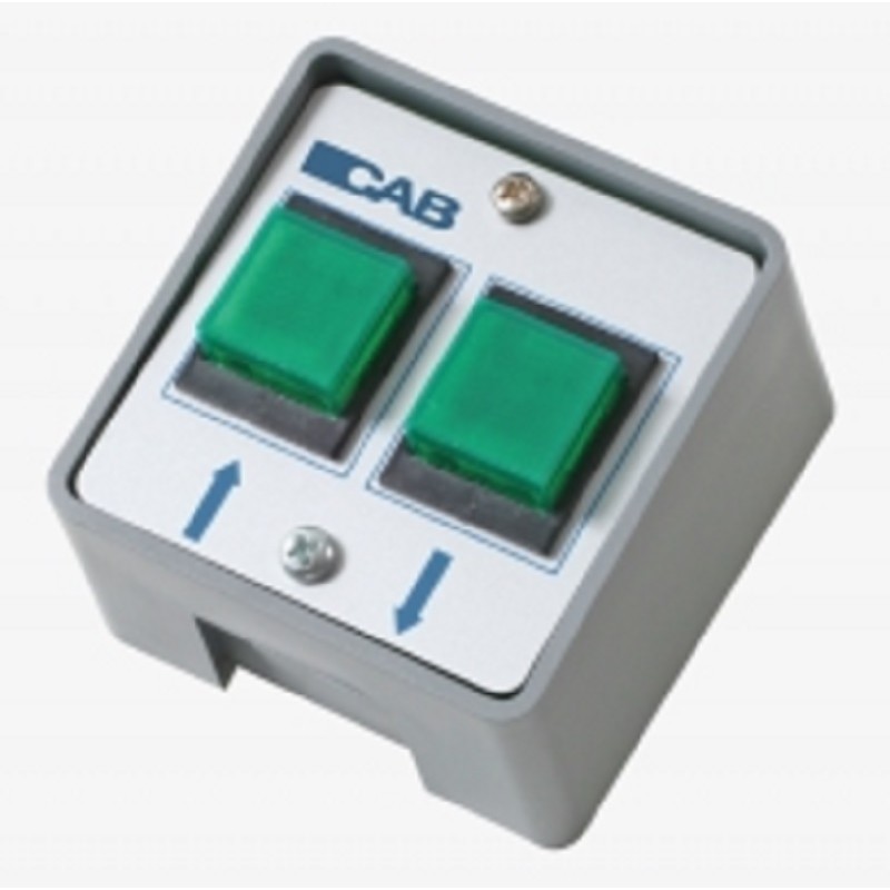 Boite à boutons poussoirs CAB BL.P, équipé 2 poussoirs coloris VERT(contact NO-250Vac/10A) fonctions MONTEE et DESCENTE, pose en SAILLIE, boitier en ABS, dimensions 73x73x44mm