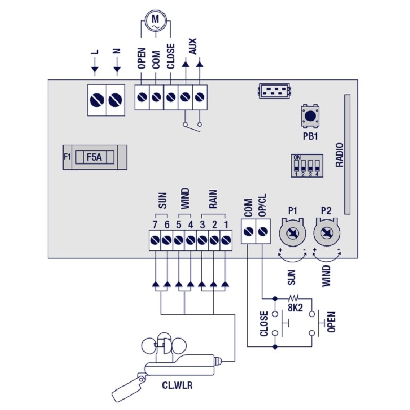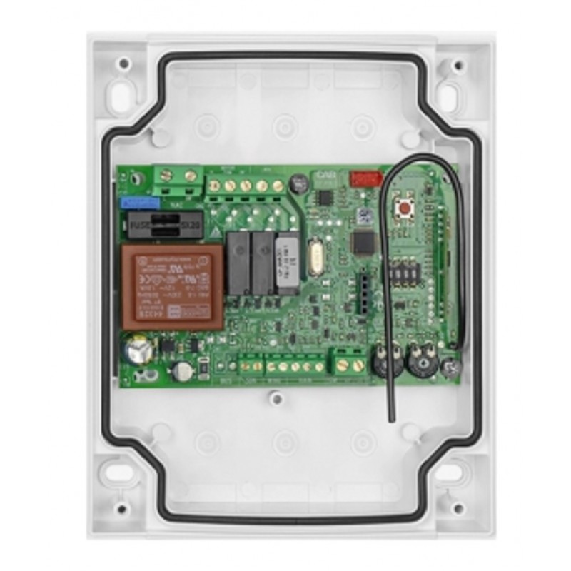 Centrale de gestion CAB SHADE pour 1 moteur tubulaire pour store et volet roulant 230Vac puissance max. 500W, réglage des paramètres et logiques de fonctionnement par potentiomètres et dip-switches, temps de fonctionnement réglable, entrées pour raccordement des capteurs de vent, soleil et pluie, fonctionnement semi-automatique et gestion des alarmes, entrées OUVERTURE et FERMETURE, LED de diagnostic, récepteur radio 433.92 MHz intégré 64 codes, 3 codifications (ARC, ROLLING CODES, codes programmable), connecteur domotique KNX (pour module X.BE non fourni), 1 sortie configurable (2° canal rad