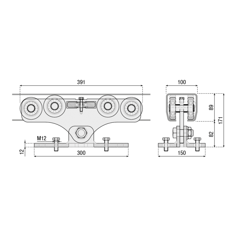 Chariot portant SERIE L à 9 ROUES (8 roues verticales, 1 roue en position centrale horizontale), en acier galvanisé, portée maximale 600Kg, largeur de passage maximum L15000mm, dimensions de la base 300x150x12mm, dimensions hors tout 391x166x150mm