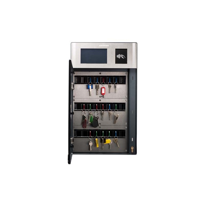 Agrandir l'image Armoire à clés INTRATONE, Module principal comprenant 1 écran tactile 7” + 1 lecteur de proximité (MIFARE) + module de transmission et accès illimité aux services de gestion à distance et mise en relation 12 ans garanties - capacité 24 trousseaux. Inclus 1 programmateur, 1 boîte de 30 étiquettes électroniques panachées, 1 feutre et 1 alimentation 15 V, dimensions 660x390x140mm, indice de protection IP20
