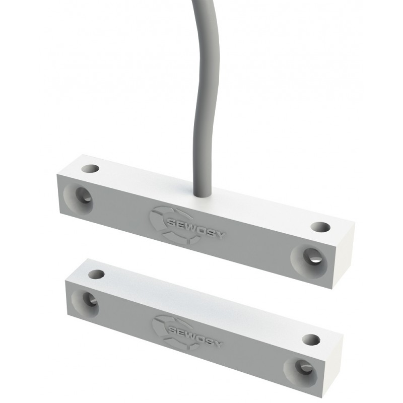 Agrandir l'image Contact MAGNETIQUE de porte METALLIQUE 3 fils SEWOSY CMA3F10, contact inverseur NO/NF 175Vdc/250mA, distance de détection 22mm, boitier en ABS blanc réctangulaire dimensions 9x46x9mm, utilisation INTERIEUR et EXTERIEURE, indice de protection IP65, longueur de câble 10m