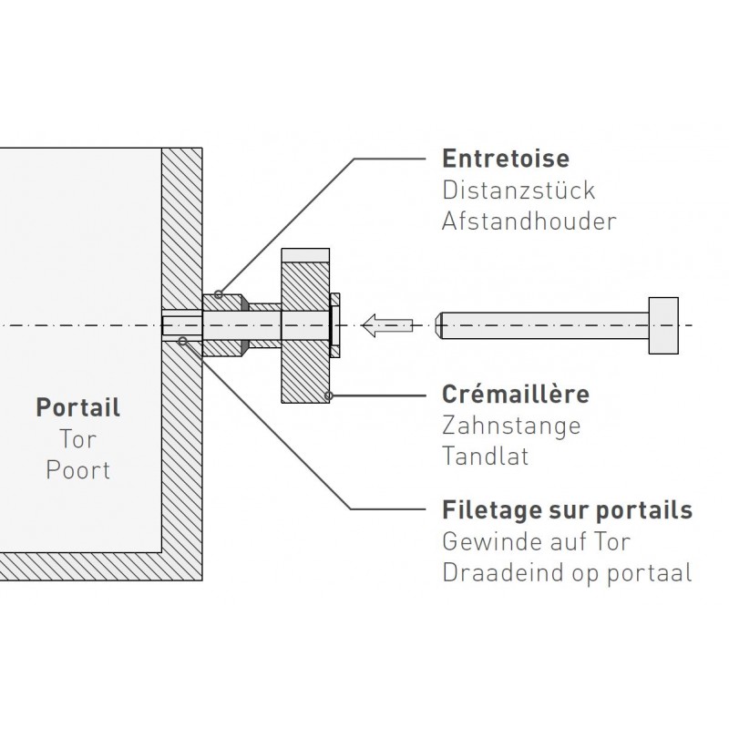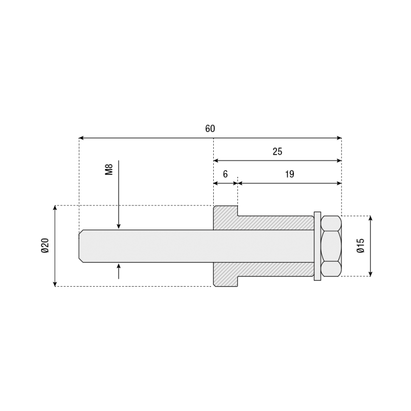 Entretoise à FIXER pour crémaillère RI.M4F, 192.1, 192.4 et 192.2, diamètre 15mm, diamètre base à souder 20mm, hauteur 6mm, hauteur totale avec tête de vis 25mm, fournie avec vis M8x60 à tête hexagonale rondelle