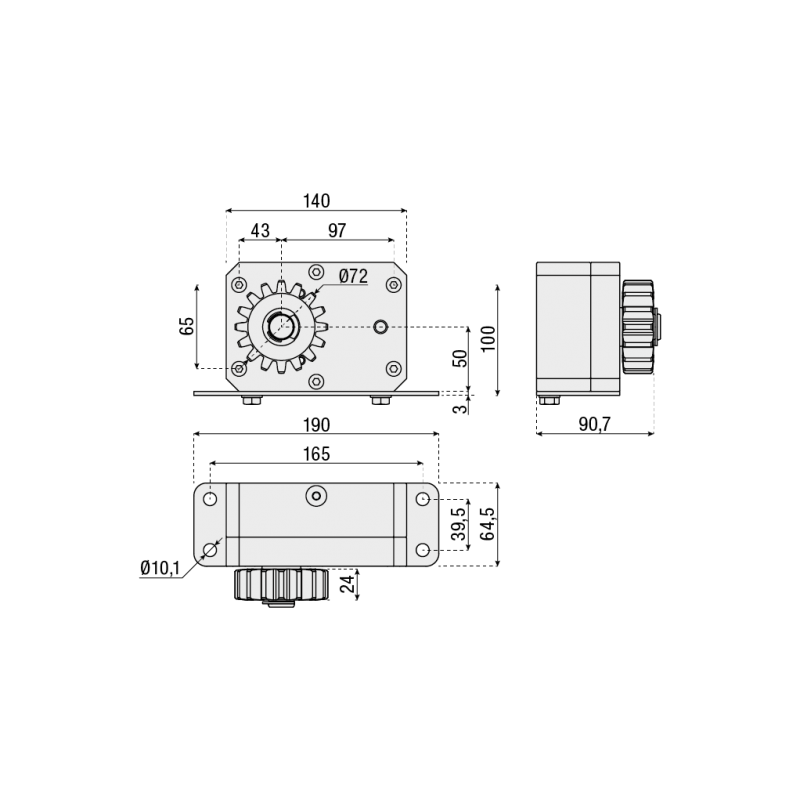 Frein hydraulique rotatif pour portail coulissant à crémaillère HIMOTIONS AHR (Amortisseur Hydraulique Radial), Pignon M4 Z16 diamètre extérieur 72mm, système auto-lubrifié par huile silicone 3000, couple de freinage réglable maximum 30 Nm, température de fonctionnement entre -15°C et +70°C, dimensions boitier 140x100x65mm, dimensions hors tout 190x100x91mm