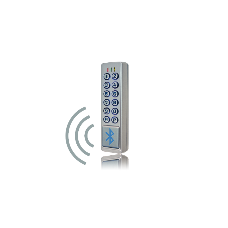Agrandir l'image Digicode ETROIT, 2 rangées de 6 touches métalliques rétro-éclairées et gravées, lecteur BLUETOOTH intégré (distance maximale de lecture 15m), 1 sortie relais (24V/1A, NO/NF) programmables BISTABLE ou MONOSTABLE (1s à 240s), entrée bouton poussoir, 2 témoins lumineux, signalisation sonore, capacité maximale 120 codes (codes + Bluetooth), boitier metallique, montage en SAILLIE, dimensions 170x45x30mm, indice de protection IP65 - ANTIVANDALE IK08, alimentation 12 à 24Vac/dc, consommation maximale 65mA