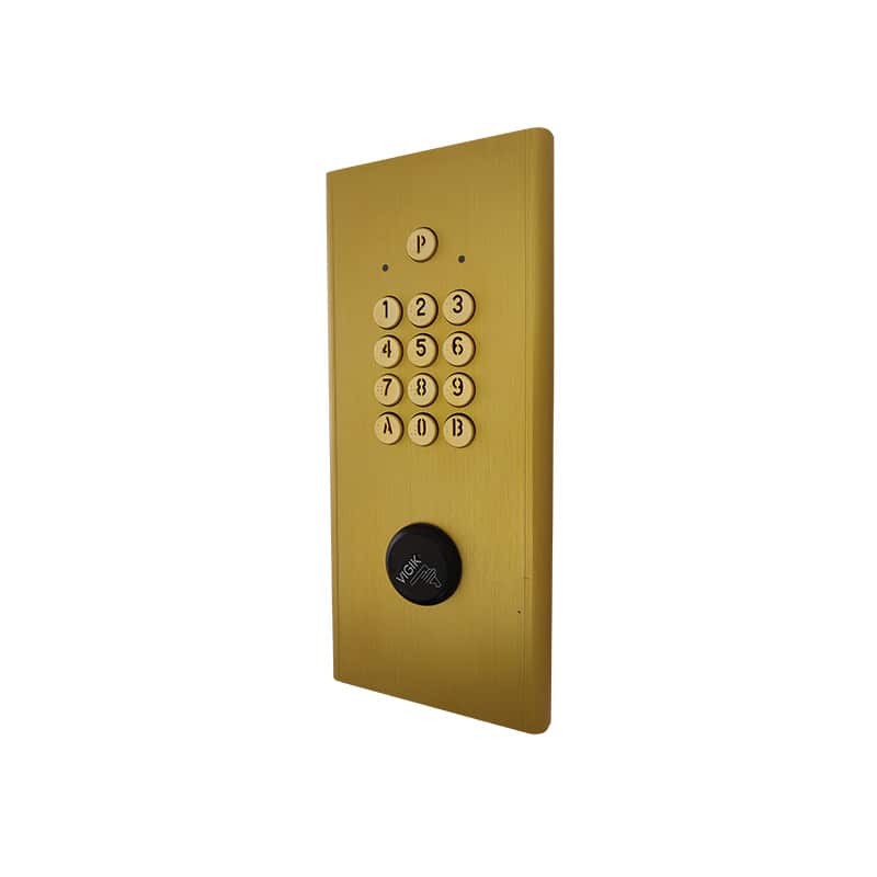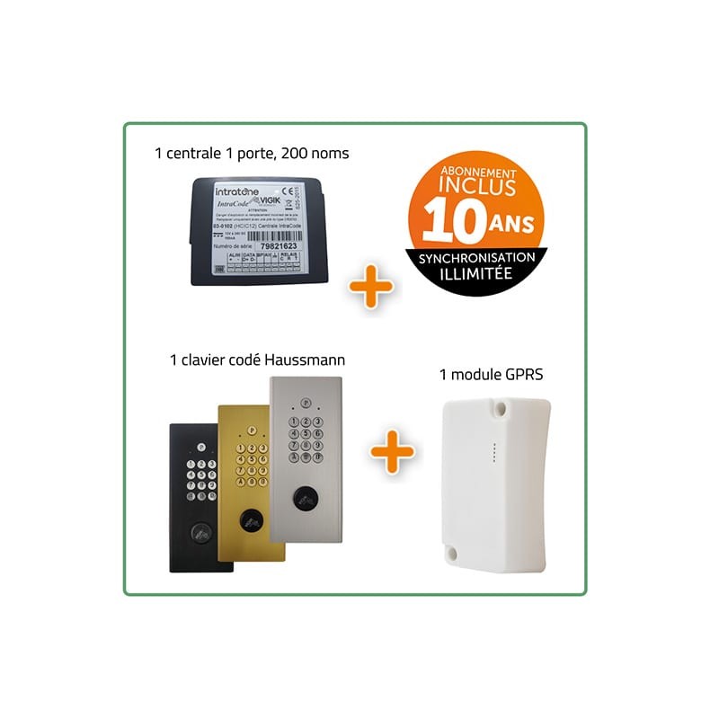 INTRABOX INTRATONE Eco Data CLAVIER CODE HAUSSMANN comprend 1 DIGICODE HAUSSMANN V3 12 touches rétro-éclairées "BRAILLES" avec lecteur de proximité VIGIK (HLPV-0/04-0104) -- avec entrée bouton poussoir, 1 centrale 1PORTE HCIC12 (03-0102), 40 codes, jusqu'à 3000 badges/pass, montage ENCASTRE pose extérieure IP65, finition OR, dimensions 120x270x17mm, dimensions cuve d'encastrement 96x165x42mm, 1 module de transmissions synchronisation des données GPRS DATA illimitées 10 ans, fonction HORLOGE hebdomadaire incluant les jours féries, compatible MOBIPASS code 25-0036 (non fournie), 1 entrée ALERTE