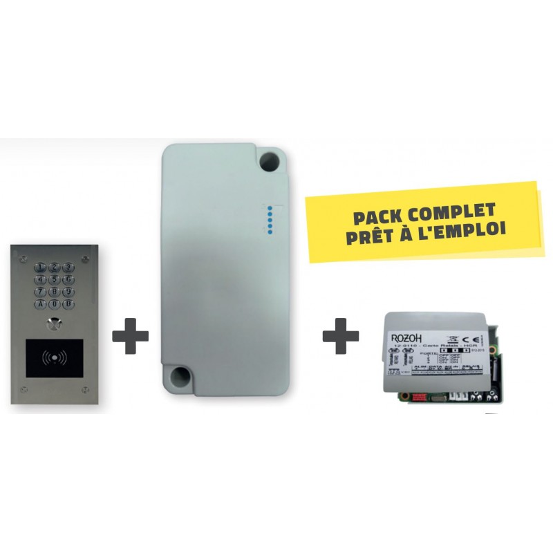 Agrandir l'image ROZOH BOX Contrôle d'accès DIGICODE comprenant un clavier codé AVEC LECTEUR (R302-0001) 12 touches avec repère "BRAILLE", de 500 codes, lecteur de badges "MAINS LIBRES" - Finition INOX - Pose en ENCASTREMENT (boitier pour pose en saillie R801-0004, non fournie) - Dimensions 120x250x2.5mm, dimensions d'encastrement 101x220x3.7mm - Indice de protection IP54 + une carte relais (R103-0001) + une centrale de gestion CA (R101-0006), gestion jusqu'à 1000 utilisteurs, 500 codes, fonction HORLOGE 5 plages horaires/365 jours incluant jours fériés et vacances scolaires, dimensions 90x183x72.5mm, alimen