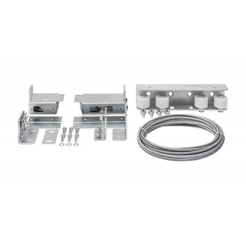 Agrandir l'image Kit accessoires galvanisés HIMOTIONS série 280, montage LATERAL, pour câble diamètre 5mm, pour entrainement portail coulissant TELESCOPIQUE sur RAIL - Comprend les articles code 282.501, 282.511, 282.541, 282.551, 283.401 (Guide à 4 olives D40) et 284.501 (10m câble anti-giratoire D5mm 7x19 galvanisé) -