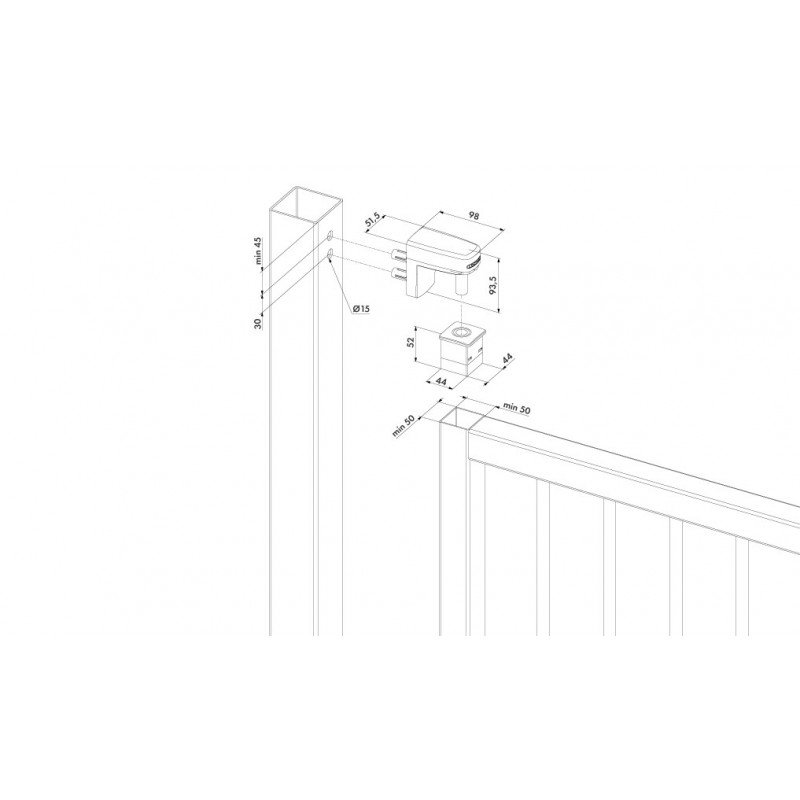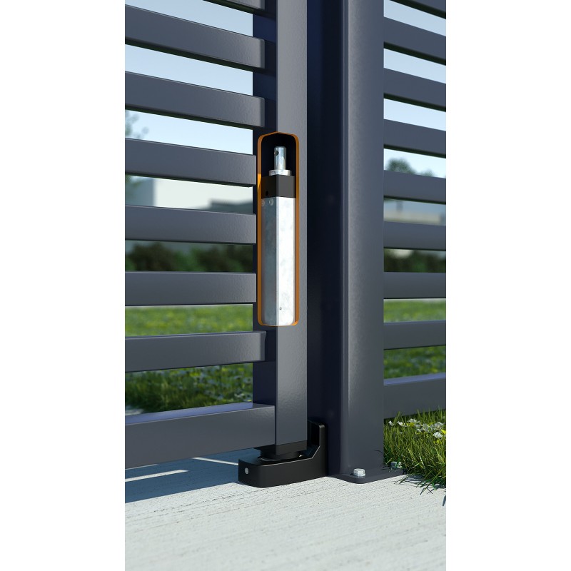 Ferme portail hydraulique INTEGRE et réversible LOCINOX INTERIO, ouverture 125° (prévoir butée GATESTOP non fournie), largeur max du vantail 1500mm, poids maximal 150Kg, coffre en aluminium thermolaqué, réversible: pour porte gauche ou droite, adaptable pour profil 50 et 60mm ep. 2mm, fixation rapide QUICK-FIX, souplesse d'ouverture: 20Nm max., dimensions 44x44x385.5mm