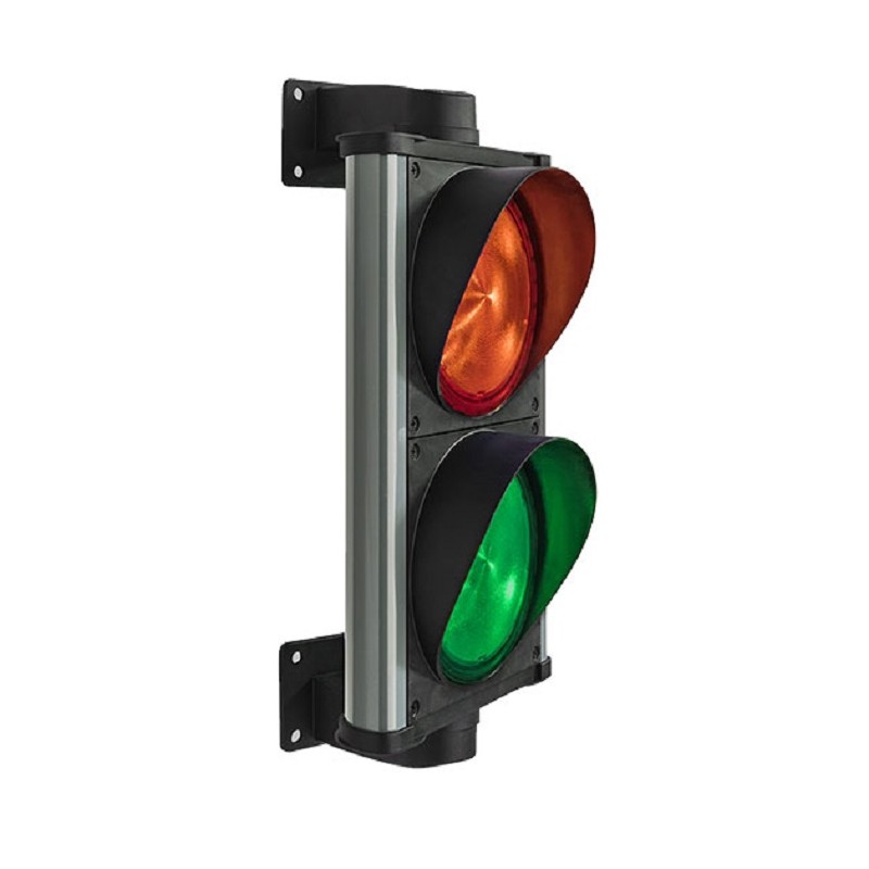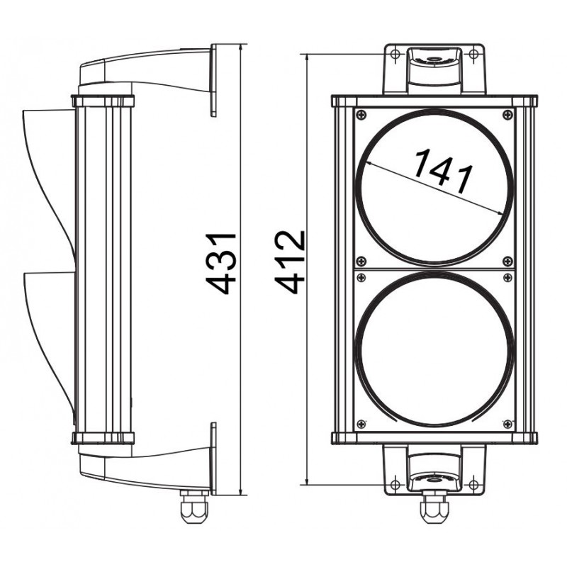 Feu de signalisation modulaire BICOLORE à LED, 2 lentilles avec visière diamètre 141mm à 24 led, couleur ROUGE et VERTE, luminosité 70 Lux, alimentation multitensions de 24V à 230Vac/dc - consommation 2 à 5W, profil en aluminium, capotage en technopolymère, orientable à 180°, montage en APPLIQUE, dimensions hors tout: profonfeur 184mm, hauteur 431mm, indice de protection IP66