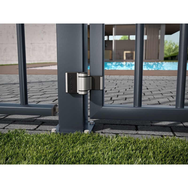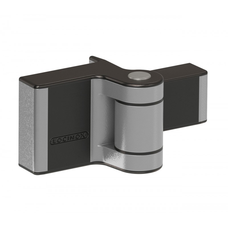 Paire de charnières ouverture 180° montage en applique à visser LOCINOX PUMA, en aluminium thermolaqué finition ARGENT, dimensions maximales de la porte: 60Kg, largeur 1000mm, REVERSIBLE pour portes gauches et droites, réglage 20mm en hauteur et 15mm en largeur, fixation rapide QUICK-FIX entraxe perçage 40mm, diamètre 15mm, dimensions: 107x60x45mm
