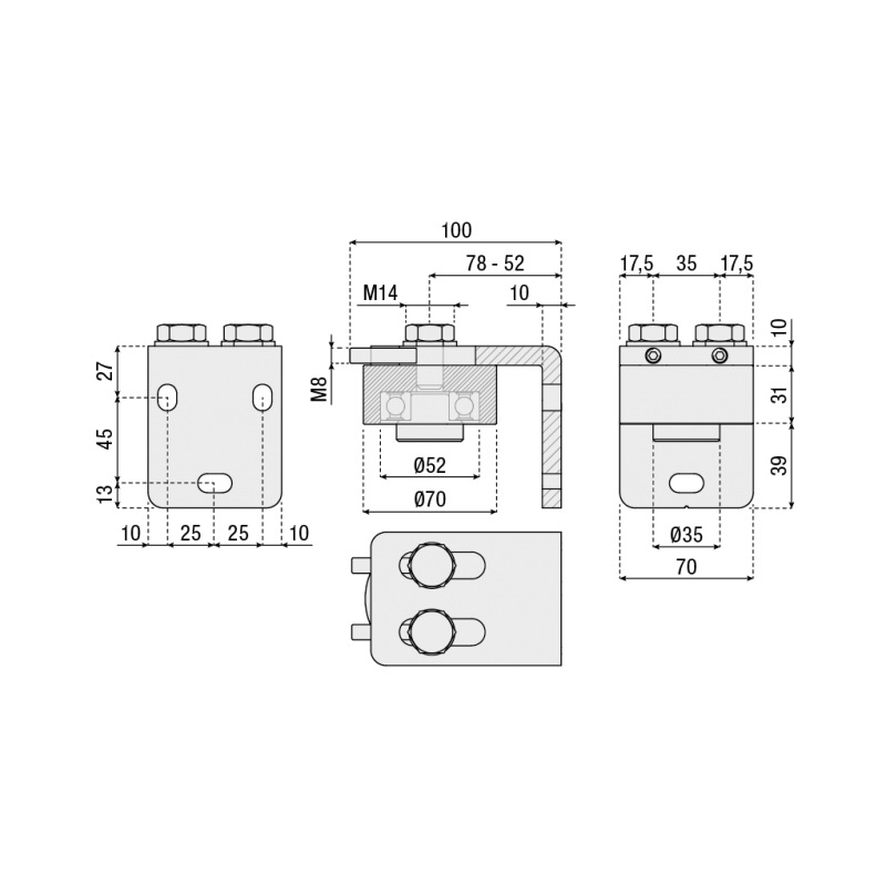 Gond supérieur en acier galvanisé avec ROULEMENT, diamètre cage D70mm pour tube 60mm, support à FIXER profondeur L100mm, largeur P60mm, hauteur H80mm, épaisseur 10mm, réglage profondeur 52 - 78mm, 3 trous de fixation diamètre 8.5mm, poids maximum du vantail 500Kg