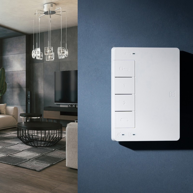 Combiné intérieur "MAINS LIBRES" ACIFARFISA série ASTRO, technologie BUS DUO (2fils), 4 boutons (dont 1 ouvre porte et 1 réponse), 2 LED de signalisation, 4 sonneries disponibles, fonction réponse automatique, programmation via Bluetooth, montage en APPLIQUE, dimensions 128x92x28mm, coloris BLANC
