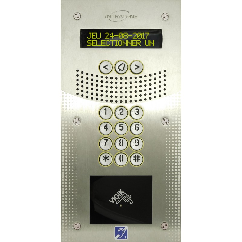 Agrandir l'image Platine VIDEO V4 INTRATONE à défilement de noms, caméra PINHOL invisible, finition INOX avec DIGICODE 12 touches rétro-éclairées BRAILLE, lecteur proximité VIGIK "MAINS LIBRES" et BOUCLE AUDITIVE intégrée, pose en ENCASTREMENT, dimensions PLATINE 150x300x9mm, dimensions CUVE D'ENCASTREMENT 126x274x45mm, alimentation 12/24Vdc 2.5A (non fournie)