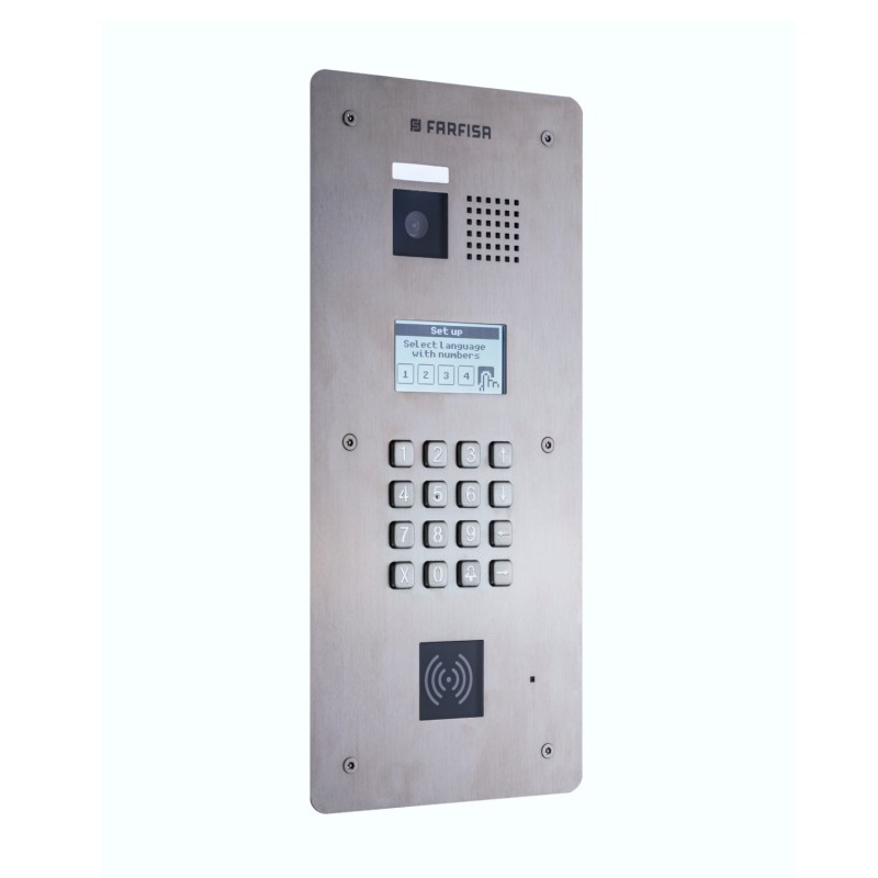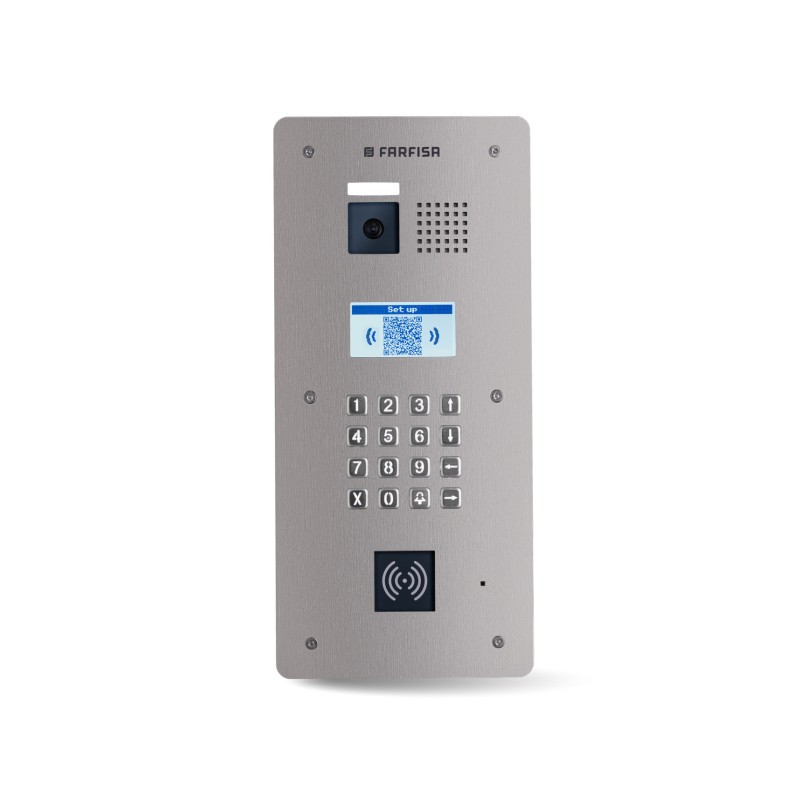 Platine de rue VIDEO à défilement de noms ACIFARFISA IP EVO, protocole WebRTC, connexion WIFI ou ETHERNET RJ45, façade ANTI-VANDALE en INOX 316L satiné, boutons INOX, caméra GRAND ANGLE 5 Mpx vision nocturne, afficheur LCD graphique rétro-éclairé, BOUCLE AUDITIVE intégrée, synthèse VOCALE, capacité 100 utilisateurs, digicode 12 touches rétro-éclairées, avec repère sur touche 5, accès par QRcodes et application mobile, pré-disposition pour lecteur VIGIK (non fourni), 1 sortie relais NO 12V/1A, entrée bouton poussoir, alimentation POE ou 12Vac/1A (PRS210 non fournie), montage à ENCASTRER, dime