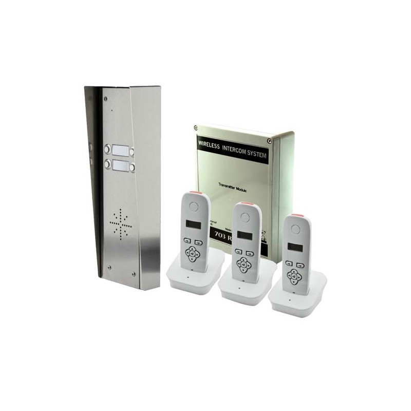 Agrandir l'image Interphone AUDIO, sans fil DECT (liaison numérique) AES-GLOBAL, platine de rue ANTI-VANDALE rétro-éclairée à 4 boutons d'appel et façade INOX BS316 brossé (IP55), dimensions 111x293x70mm, montage en SAILLIE, module liaison radio 1.88GHz portée 200m*, 2 relais de commande NO/NF (24V/2A), alimentation 24Vac/dc (fournie), fourni avec 4m de câble CAT5 blindé (longueur maximale 4m), 3 combinés sur base coloris blanc (150x50x26mm) fonctionnant sur batteries avec fonction REPONDEUR