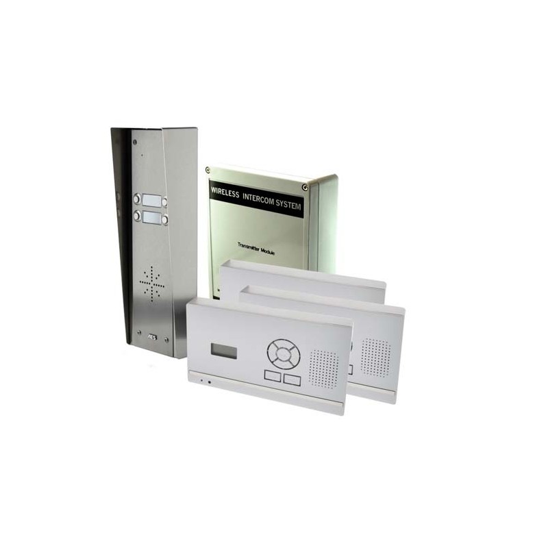 Interphone AUDIO, sans fil DECT (liaison numérique) AES-GLOBAL, platine de rue ANTI-VANDALE rétro-éclairée à 4 boutons d'appel et façade INOX BS316 brossé (IP55), dimensions 111x293x70mm, montage en SAILLIE, module liaison radio 1.88GHz portée 200m*, 2 relais de commande NO/NF (24V/2A), alimentation 24Vac/dc (fournie), fourni avec 4m de câble CAT5 blindé (longueur maximale 4m), 3 combinés MAIN LIBRE, montage mural, coloris blanc (162x92x40mm) avec fonction REPONDEUR