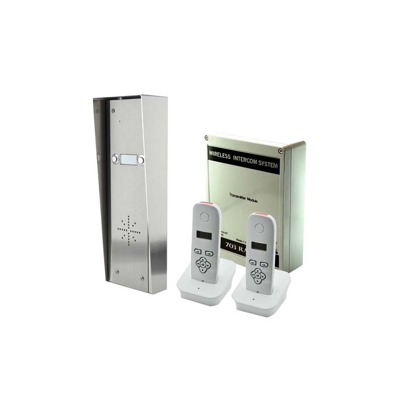 Agrandir l'image Interphone AUDIO, sans fil DECT (liaison numérique) AES-GLOBAL, platine de rue ANTI-VANDALE rétro-éclairée à 2 boutons d'appel et façade INOX BS316 brossé (IP55), dimensions 111x293x70mm, montage en SAILLIE, module liaison radio 1.88GHz portée 200m*, 2 relais de commande NO/NF (24V/2A), alimentation 24Vac/dc (fournie), fourni avec 4m de câble CAT5 blindé (longueur maximale 4m), 2 combinés sur base coloris blanc (150x50x26mm) fonctionnant sur batteries avec fonction REPONDEUR