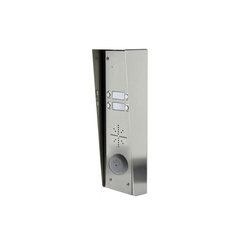 Interphone AUDIO, sans fil DECT (liaison numérique) AES-GLOBAL, platine de rue ANTI-VANDALE rétro-éclairée à 4 boutons d'appel et façade INOX BS316 brossé (IP55), dimensions 111x293x70mm, montage en SAILLIE, emplacement pour tête VIGIK T25 (non fournie), module liaison radio 1.88GHz portée 200m*, 2 relais de commande NO/NF (24V/2A), alimentation 24Vac/dc (fournie), fourni avec 4m de câble CAT5 blindé (longueur maximale 4m), 4 combinés sur base coloris blanc (150x50x26mm) fonctionnant sur batteries avec fonction REPONDEUR
