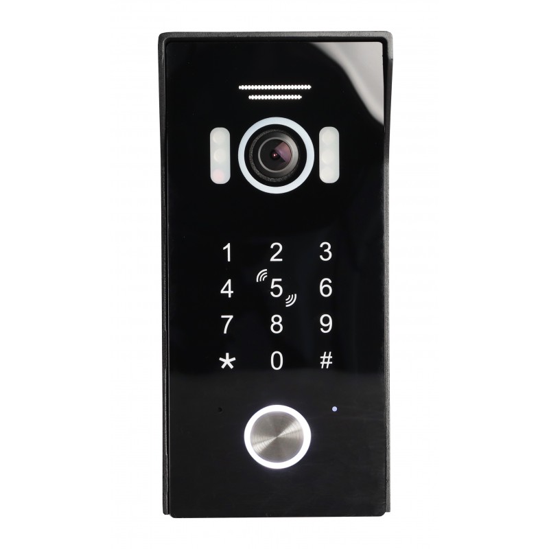 Visiophone AES-Global ONYX, transmission DECT/RADIO 2.4GHz distance maximale 100m* en champs libre, platine de rue vidéo 1 bouton d'appel avec caméra nocturne 1.3 Mpx angle de vue 120°, digicode 12 touches rétroéclairées (200 codes max), lecteur de badges MIFARE 13.56MHz (200 badges max, fourni avec 2 badges), synthèse vocale, 1 sortie relais NO/NC 30Vdc/1A, dimensions platine de rue 144x68x43mm, indice de protection IP55, fourni avec alimentation 12Vdc/2A -- Moniteur à poser LCD tactile 7" (17.7cm) avec connexion WIFI, lecteur de carte SD 32Go max (non fournie) pour vidéo et photos, dimensi