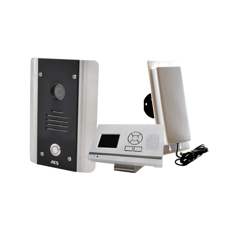 Agrandir l'image Interphone VIDEO, sans fil DECT AES-GLOBAL, platine de rue ANTI-VANDALE rétro-éclairée à 1 bouton d'appel et façade INOX BS316 brossé et acrylique coloris noir (IP55), caméra couleur à angle de vision 80° avec vision nocturne (LED IR), dimensions 160x202x40mm, montage en SAILLIE, module liaison radio DOUBLE TECHNOLOGIE, fréquence transmission audio 1.88GHz, fréquence transmission vidéo 2.4GHz, portée 100m*, 1 relais de commande NO/NF (24V/2A), alimentation 24Vdc (fournie), fourni avec 3m de câble CAT5 blindé (longueur maximale 8m), Combiné VIDEO mural "MAINS LIBRES", écran LCD couleur 3,5", 7