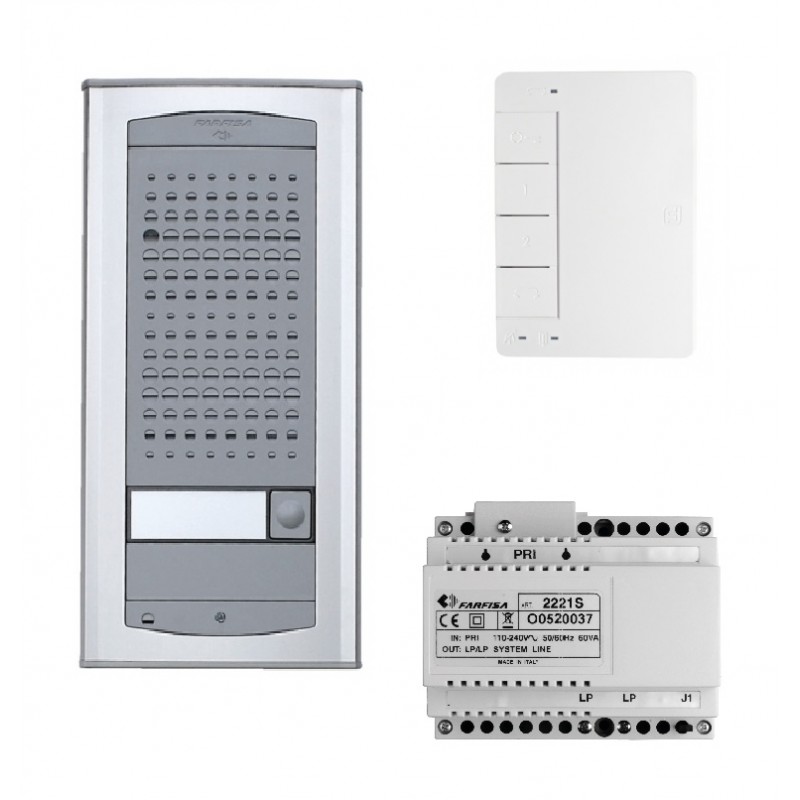 Agrandir l'image Kit interphone audio ACIFARFISA, platine de rue 1 bouton d'appel AGORA LIGHT AD2101AGL, boitier et façade en ABS sur cadre aluminium, dimensions 99x208x30mm, montage SAILLIE, 1 combiné "mains libres" audio ASTRO AT972 à 4 boutons, dimensions 128x92x28mm, montage saillie, coloris blanc, système bus DUO (2fils)