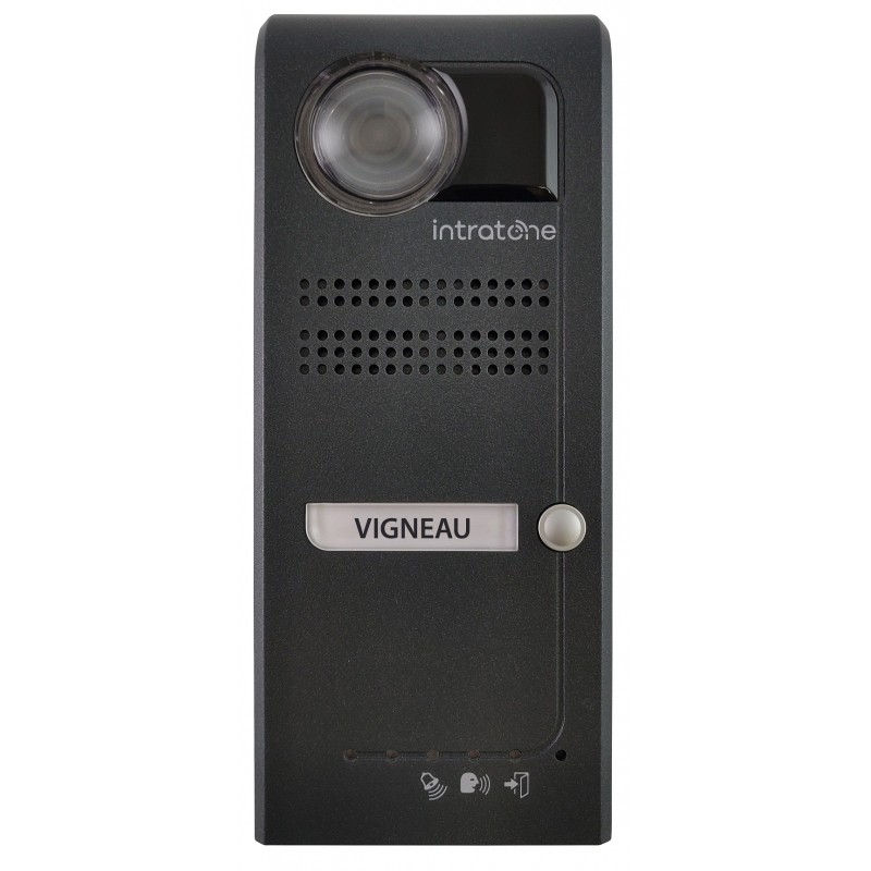 Agrandir l'image Interphone GSM VIDEO INTRATONE VILLA, 1 bouton d'appel, récepteur HF 868MHz 2 canaux intégré avec 2 télécommandes, bloc GSM intégré dans la platine (inclus gestion à distance et mise en relation vidéo garanties 15 ans), pose en SAILLIE, extérieur IP54, finition ANTHRACITE, dimensions 88x206x35mm, jusqu'à 40 télécommandes/clémobil, fonction CLEMOBIL, HORLOGE hebdomadaire, relevés d'évènements, alimentation 12-24Vac/dc 1A (non fournie)