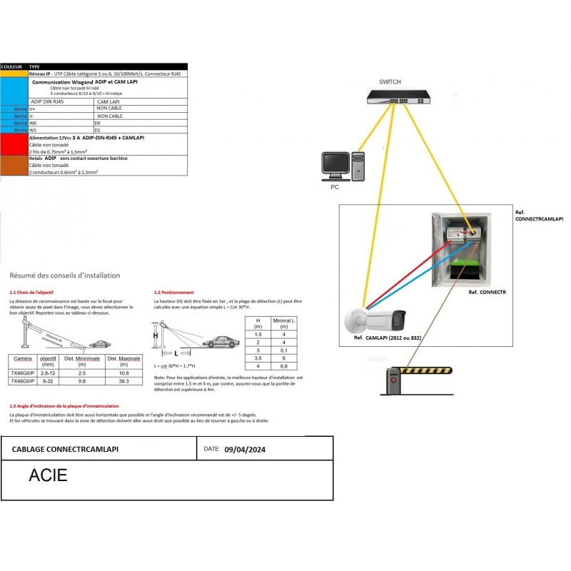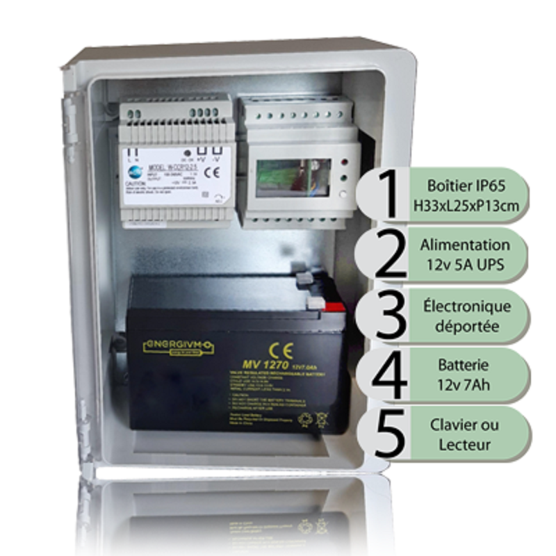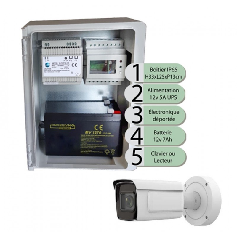 Kit contrôle d'accès autonome connecté par lecture de PLAQUE d'IMMATRICULATION, comprend 1 contrôleur ADIP DIN-RJ45, alimentation 12Vdc300mA, webserver intégré, 2 entrées pour lecteurs WIEGAND 26, 34, 44 bits, gestion jusqu'à 65000 utilisateurs, 2 sorties relais NO/NF programmables, 3 entrées programmable, dimensions boitier ADIP 90x65x70mm, 1 alimentation DIN 12Vdc UPS, 1 batterie 12Vdc/7Ah, 1 camera pour Lecture de plaque d' 'immatriculation caméra ANPR, IP, 4MP, DeepinView, Objectif 2.8-12mm, vison nocture IR50 M, indices IP67 IK10, Technologie DarkFighter 140dB WDR - Option support potea
