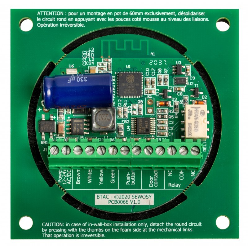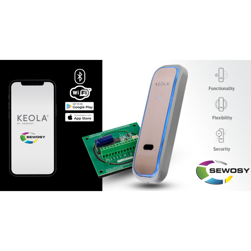 Solution de contrôle d'accès connectée - Bluetooth 4.2 + WIFI 2.4GHz - SEWOSY KEOLA K1-W, mode autonome ou connecté WIFI, lecteur "mains libres" smartphone + paramétrage via BLUETOOTH + application KEOLA (Androïd 4.4 + iOS12), distance détection réglable 3 à 80cm, signalisation sonore / lumineuse à LED 7 états (veille, connecté, accés autorisé ou refusé, en maj, porte forcée et autoprotect.), gestion en TEMPS REEL max 250 util., PLAGES HORAIRES, authentification simple ou double, liaison BUS RS232 fourni avec 3m de câble (4x0.22mm²/AWG23 max 30m), boitier coloris gris + finition aluminium AS,