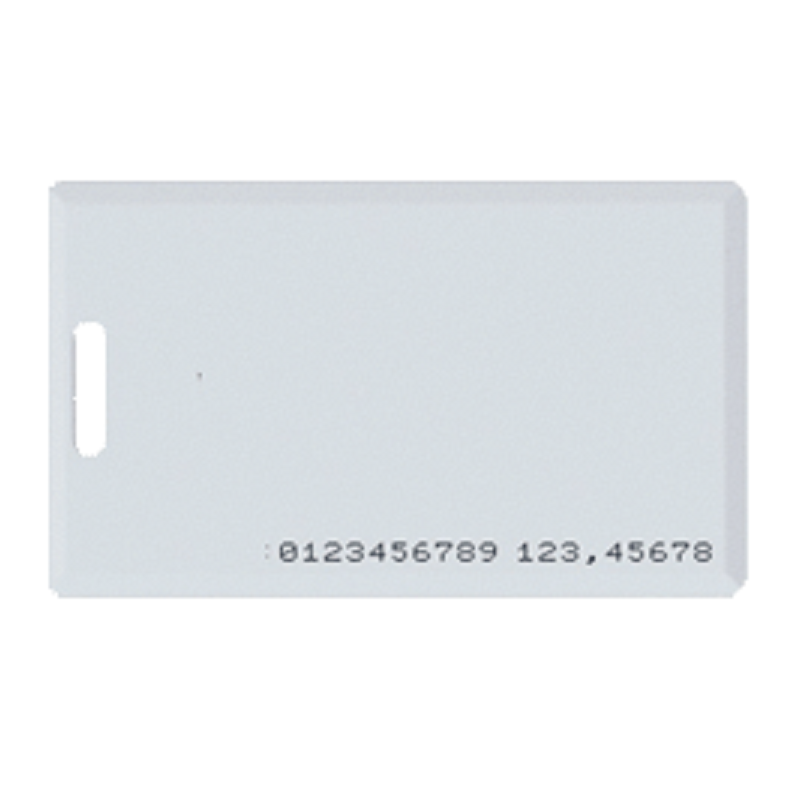 Agrandir l'image Badges passif de proximité format MIFARE 13.56MHz NISO CLAMSHELL (carte bancaire) pour lecteur MIFARE 13.56MHZ, lecture et écriture, dimensions 86x54x1.8mm, finition PVC RIGIDE coloris blanc, perforation pour lacet, numéro UID gravé en décimal et hexadécimal
