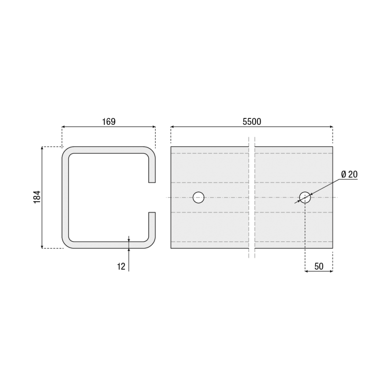 Monorail de guidage en acier BRUT pour portail coulissant autoportant HIMOTIONS SERIE XXL, dimensions longueur L5500mm, section 184x169mm, épaisseur 12mm, poids 54.50Kg/m **** Attention, ne pas galvaniser à chaud ****