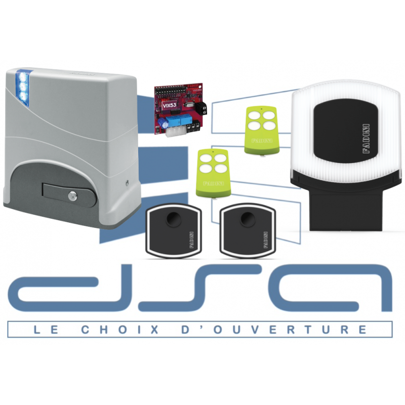 Kit automatisme FADINI JUNIOR 633, 0.33CV, 230Vac, pour portail coulissant poids maximum 600Kg, lubrification à BAIN HUILE - Comprend: 1 x motoréducteur JUNIOR 633L, 1 x lampe de signalisation ZERO.L 152L, 1 x jeu de cellules ZERO.PH 140L, 1 x récepteur radio VIX53 5311L, 2 x télécommandes VIX53 5313GL -