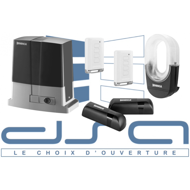 Kit d'automatisme à motoréducteur 24Vdc pour portail coulissant BENINCA KBULL624ESA, poids maximum du portail 600Kg. Le kit comprend: 1 x motoréducteur BULL624ESA avec CP.B24ESA intégrée (détection d'obstacle, ENCODEUR, AUTO-APPRENTISSAGE, ralentissements, récepteur radio 433.92MHz code ARC intégré) 1 x jeu de photo-cellules PUPILLA.T 1 x lampe de signalisation IRI.LAMP 2 x télécommandes IRI.TX4AK