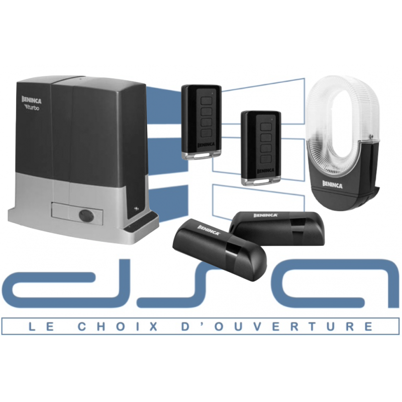 Kit d'automatisme à motoréducteur 24Vdc pour portail coulissant BENINCA KBULL624TURBO, "RAPIDE" vitesse jusqu'à 25m/min, équipé d'un capteur de fin de course MAGNETIQUE, poids maximum du portail 600Kg, livré avec 1 motoréducteur BULL624TURBO avec CP.B6-1024 TURBO intégrée (détection d'obstacle, ENCODEUR, AUTO-APPRENTISSAGE, ralentissements, chargeur de batteries) , 1 jeu de photo-cellules PUPILLA.T, 2 télécommandes IRI.TX4VA, 1 lampe de signalisation IRI.LAMP