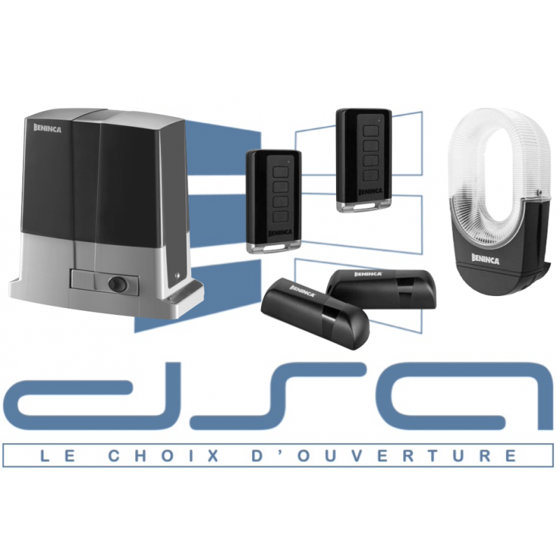 Kit d'automatisme à motoréducteur 24Vdc pour portail coulissant BENINCA KBULL424SW, poids maximum du portail 450Kg, livré avec 1 motoréducteur BULL424SW avec CP.B24-SW intégrée avec détection d'obstacle et suivi de trajectoire par ENCODEUR virtuel STC, AUTO-APPRENTISSAGE, ralentissements, récepteur radio 433.92MHz codage ARC 128 bits intégré, prévue pour connexion au système domotique KNX (avec interface X.BE non fournie), fonction ESA + GREEN SYSTEM économie d'énergie (consommation en stanby 0.5W), le kit comprend:1 jeu de photo-cellules PUPILLA.T, 2 télécommandes IRI.TX4VA, 1 lampe de sign