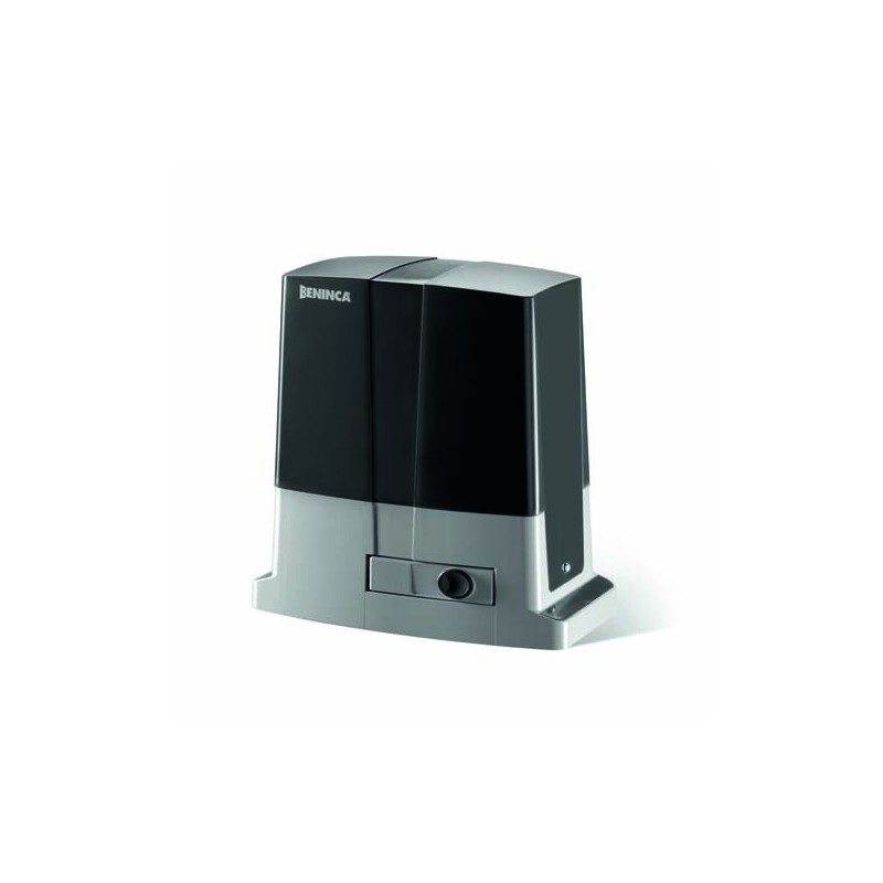 Motoréducteur 230Vac pour portail coulissant BENINCA BULL8OM, lubrification par BAIN D'HUILE, moteur 230Vac monophasé, centrale de gestion 230Vac intégrée, récepteur radio 433MHz (ARC-ROLLING CODES-codes programmables) intégré, capteur de fin de course mécanique, ENCODEUR intégré, ralentissements, AUTO-APPRENTISSAGE, poids maximum du vantail 800Kg, vitesse 10.5m/min, pignon M4 Z18, dimensions 326x210x330mm, indice de protection IP44