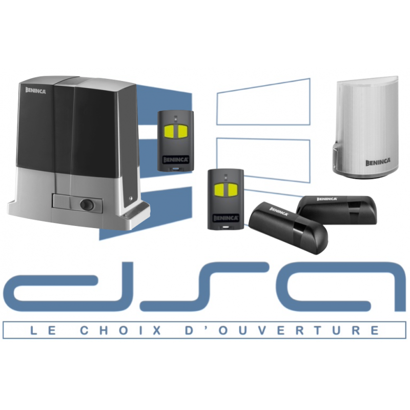 Kit d'automatisme à motoréducteur 24Vdc pour portail coulissant BENINCA KBULL624ESA, poids maximum du portail 600Kg, livré avec 1 motoréducteur BULL624ESA avec CP.B24ESA intégrée (détection d'obstacle, ENCODEUR, AUTO-APPRENTISSAGE, ralentissements) , 1 jeu de photo-cellules PUPILLA.T, 2 télécommandes TO.GO2VA, 1 lampe de signalisation STAR