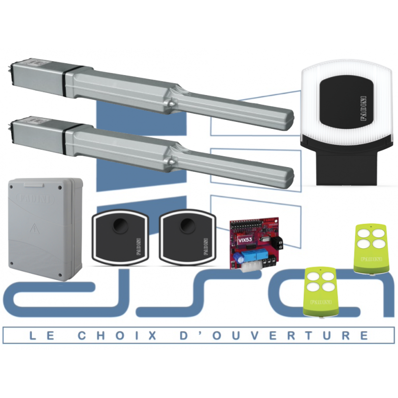 Agrandir l'image Kit vérins hydrauliques course 240mm FADINI HINDI SPRINT, pour portail double battants PIVOTANTS, dimensions maximum du vantail L2300m, poids 400Kg - Comprend: 2 x vérins HINDI880 SPRINT 888L, 1 x programmateur ELPRO27 7047L, 1 x lampe de signalisation ZERO 152OL avec antenne intégrée, 1 x jeu de cellules TRIFO11 107L, 1 x récepteur radio VIX53 5311L, 2 x télécommandes VIX53 5313GL -