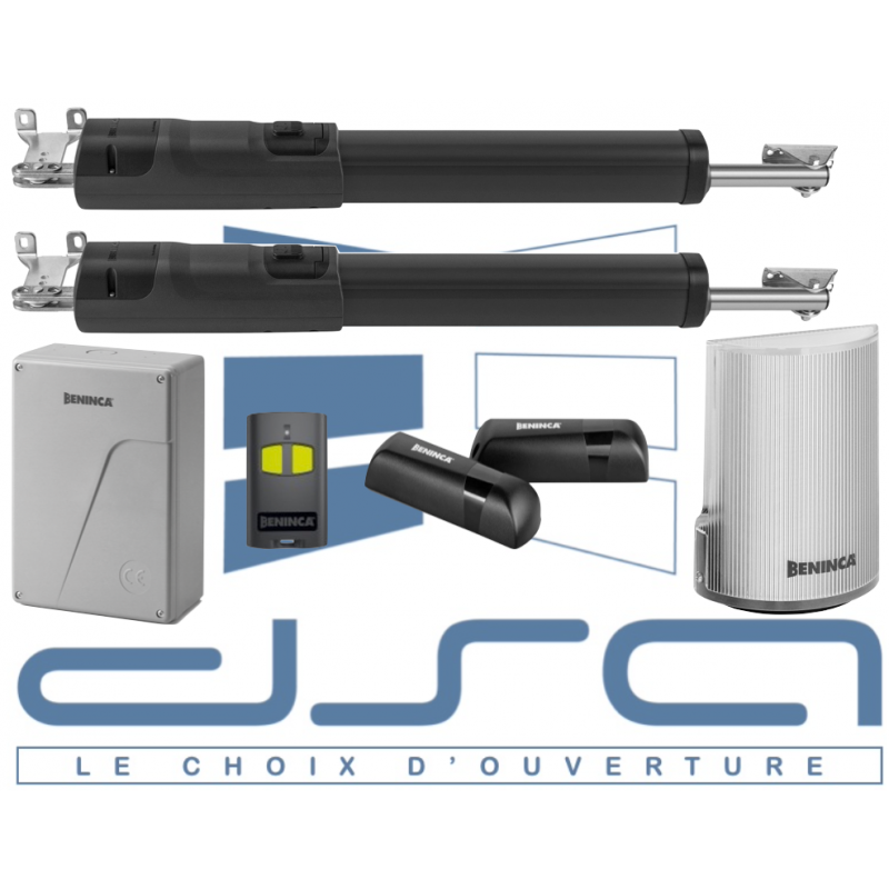Kit d'automatisme à vérins électromécaniques TELESCOPIQUES à vis sans fin 24V avec ENCODEUR pour portail double battants pivotants BENINCA KTOM4024E, longueur maximale de passage L8000mm, poids maximum de chaque vantail 600Kg, livré avec 2 vérins TOM4024E, 1 centrale de gestion TRUST24, 1 jeu de photo-cellules PUPILLA.T, 1 télécommande TO.GO2VA, 1 lampe de signalisation STAR, 2 fixations multipositions TOM.SR