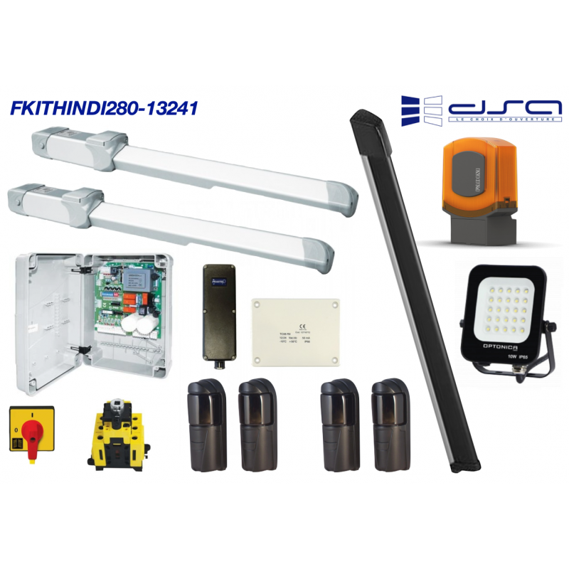 Kit d'automatisme pour portail DOUBLE BATTANT PIVOTANT pour installation conforme 13241.1, comprend 2 x vérin FADINI HINDI 88084P5L, 1 x centrale de gestion FADINI ELPRO27, 1 x palpeur mécanique NF hauteur 2000mm DSABS01-C20NE1, 1 x pont radio TCO7KIT, 2 x jeu de cellules ANTIVANDALES portée 30m DSAFT30AV, 1 x lampe de signalisation FADINI ZERO 152OL, 1 x projecteur d'éclairage de zone DSAFL10-B3, 1 x sectionneur de proximité FADINI 2731L + 2732L