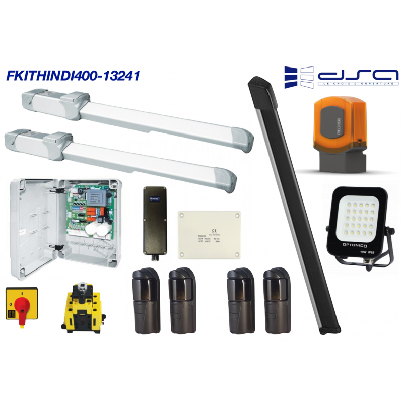 Kit d'automatisme pour portail DOUBLE BATTANT PIVOTANT pour installation conforme 13241.1, comprend 2 x vérin FADINI HINDI 89084P5L, 1 x centrale de gestion FADINI ELPRO27, 1 x palpeur mécanique NF hauteur 2000mm DSABS01-C20NE1, 1 x pont radio TCO7KIT, 2 x jeu de cellules ANTIVANDALES portée 30m DSAFT30AV, 1 x lampe de signalisation FADINI ZERO 152OL, 1 x projecteur d'éclairage de zone DSAFL10-B3, 1 x sectionneur de proximité FADINI 2731L + 2732L
