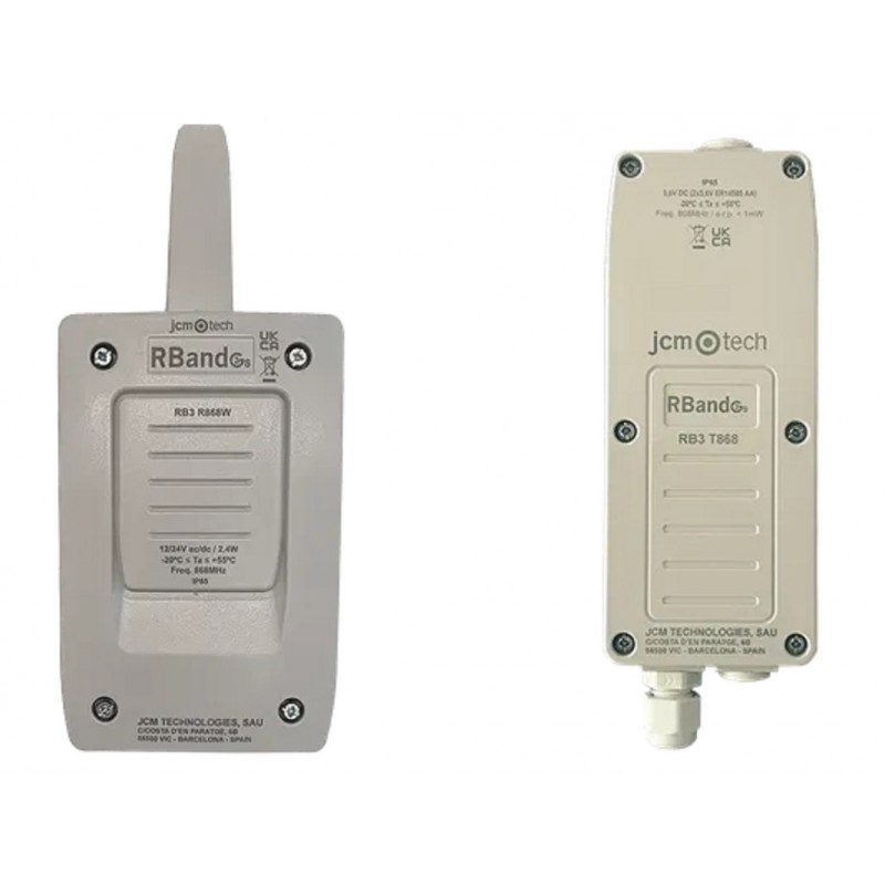 Agrandir l'image Kit pont radio 3° génération JCM RB3, comprend 1 émetteur RB3 T868 à 2 entrées barres palpeuses (optiques, résitives 8.2K et mécaniques), 4 canaux, 868MHz, alimentation 2 piles lithium AA, 3.6V/2400mAh, montage SAILLI, dimensions tranmetteur 151x60x23mm IP65; 1 récepteur RB3 R868 à 2 canaux (jusqu'à 6 émetteurs), sorties RSE (8.2K) et CSE (NF), signalisation sonnore et lumineuse, alimentation 12/24Vac/dc, consommation 255mA, cerification TÜV