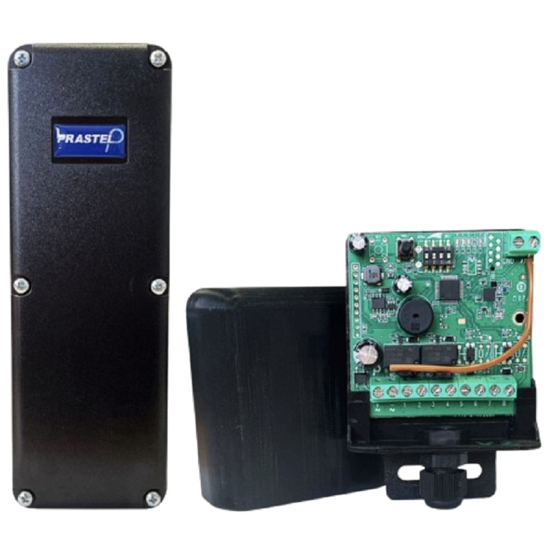 Agrandir l'image Ensemble pont radio pour barre palpeuse à contact NF ou résistive 8.2K, composé d'un émetteur TCO7SG-TX- fréquence 868MHz (portée maximale 100m*), auto-alimenté par 2 piles 1.5V type AA, 1 entrée barre palpeuse NF/8.2K, boîtier en ABS indice de protection IP67, dimensions 160x55x26mm - et d'un récepteur TCO7SG-RX - bicanal, 2 sorties relais, jusqu'à 5 émetteurs par relais, indicateur sonore contrôle niveau batteries émetteur, alimentation 12/24Vac-dc 50mA @ 12V, boîtier en ABS indice de protection IP55, dimensions 80x73x30mm -