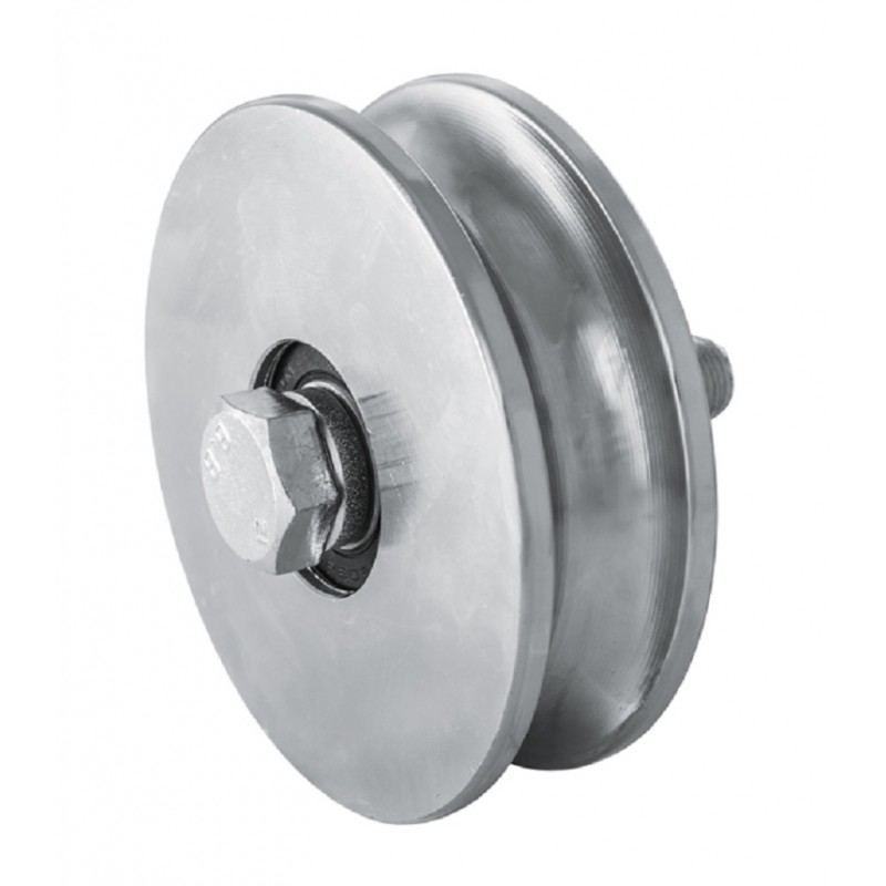 Roue en acier galvanisé avec BOULON (M14x70) et entretoises, gorge en DEMI-ROND D20mm, diamètre 120mm (118mm), épaisseur A 30mm, largeur totale B (entretoises comprises) 34mm, 2 roulements, portée maximale 500Kg