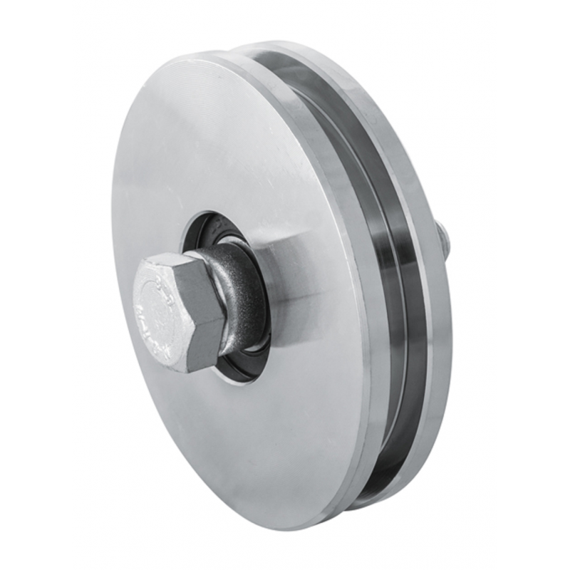 Roue en acier galvanisé avec BOULON (M12x50) et entretoises, gorge en H 8x6mm (CxH), diamètre 60mm (58mm), épaisseur A 20mm, largeur totale B (entretoises comprises) 32mm, 1 roulement, portée maximale 200Kg