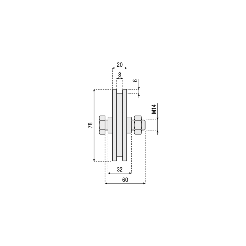 Roue en acier galvanisé avec BOULON (M14x60) et entretoises, gorge en H 8x6mm (CxH), diamètre 80mm (78mm), épaisseur A 20mm, largeur totale B (entretoises comprises) 32mm, 1 roulement, portée maximale 250Kg