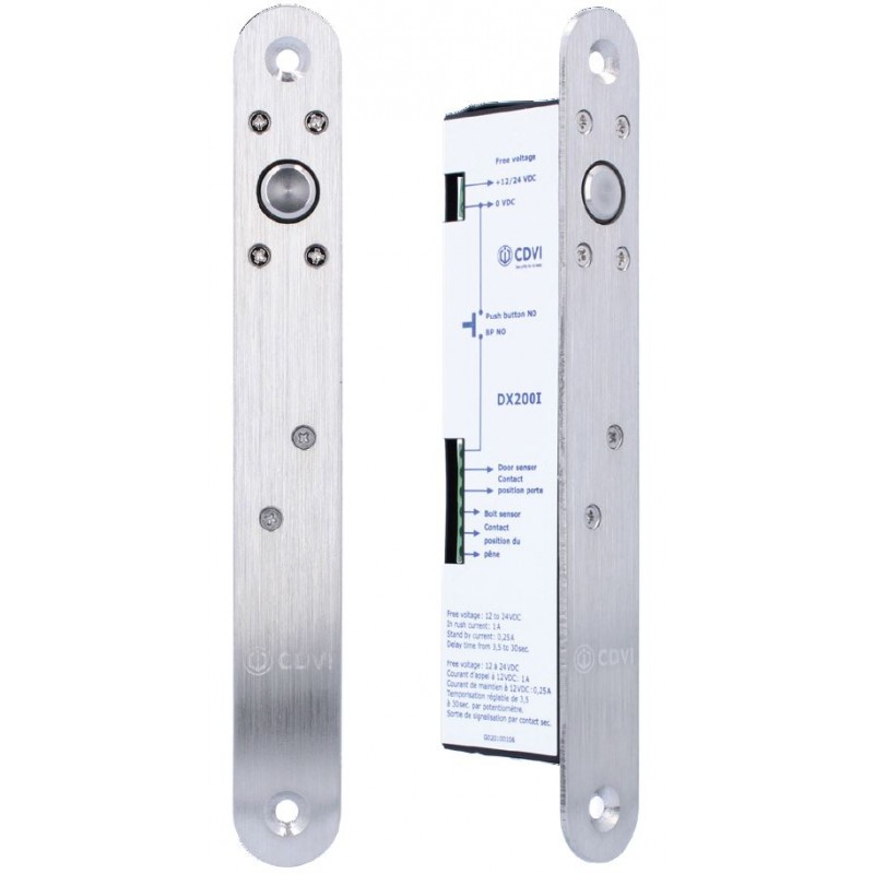 Agrandir l'image Serrure électromécanique à RUPTURE CDVI DX200I, en INOX et aluminium, équipée d'un pêne à piston autobloquant, résistant au sciage, double contacts de position : porte et pêne, signal de commande NO/NF, alimentation 12-24Vdc, consommation appel max 1.15A, maintient 0.25mA, temporisation réglable de 3.5 à 30s, montage vertical ou horizontal (nejamais installer en sol), dimensions têtière 212x27x3mm, serrure 163x22x45mm, pêne diamètre 14mm, indices de protection IP42, IK10