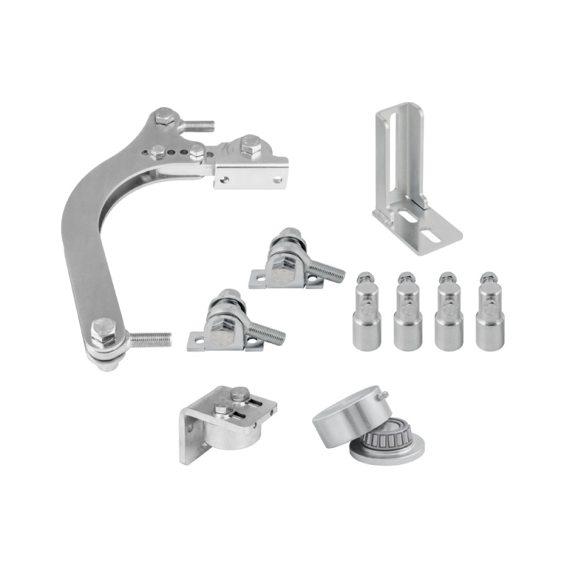 Kit XL système pour portail à 1 battant repliable HIMOTIONS série 500, limite d'utilisation : battant composé de 2 vantaux de 400Kg/5000mm maximum chacun, soit battant déployé max 10000mm, poids 800Kg, comprend : 1 bielle réglable, 1 bride d'appui réglable, 2 brides d'articulation, 1 gond supérieur à roulement 451.42 et 1 gond inférieur à roulement 455.4
