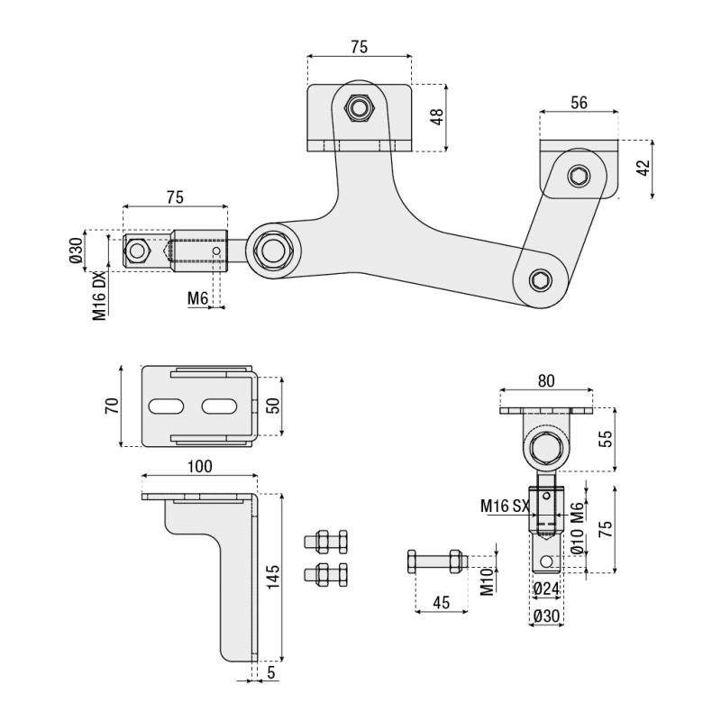 Kit M système pour portail à 1 battant repliable HIMOTIONS série 500, limite d'utilisation : battant composé de 2 vantaux de 200Kg/2000mm maximum chacun, soit battant déployé max 4000mm, poids 400Kg, comprend : 1 bielle réglable, 1 bride d'appui réglable et 2 brides d'articulation